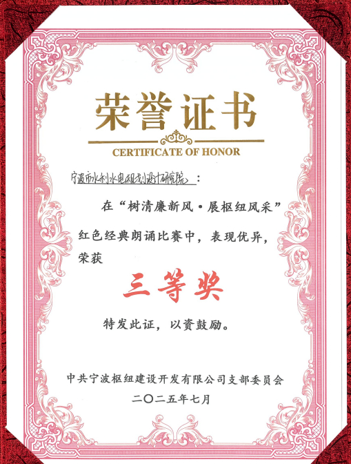 為慶祝中國共產(chǎn)黨成立104周年,2025年7月1日,寧波樞紐建設(shè)開發(fā)有限公司隆重舉行了“紅動樞紐·同心共建”迎“七一”主題黨建活動。作為寧波樞紐片區(qū)重要參建單位和黨建聯(lián)盟成員,我院黨總支書記、副院長王洪霞帶隊(duì)參與了本次活動,并且,我院兩位青年職工攜選送作品在“樹清廉新風(fēng)·展樞紐風(fēng)采”樞紐片區(qū)紅色經(jīng)典朗誦比賽中榮獲三等獎。