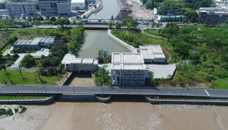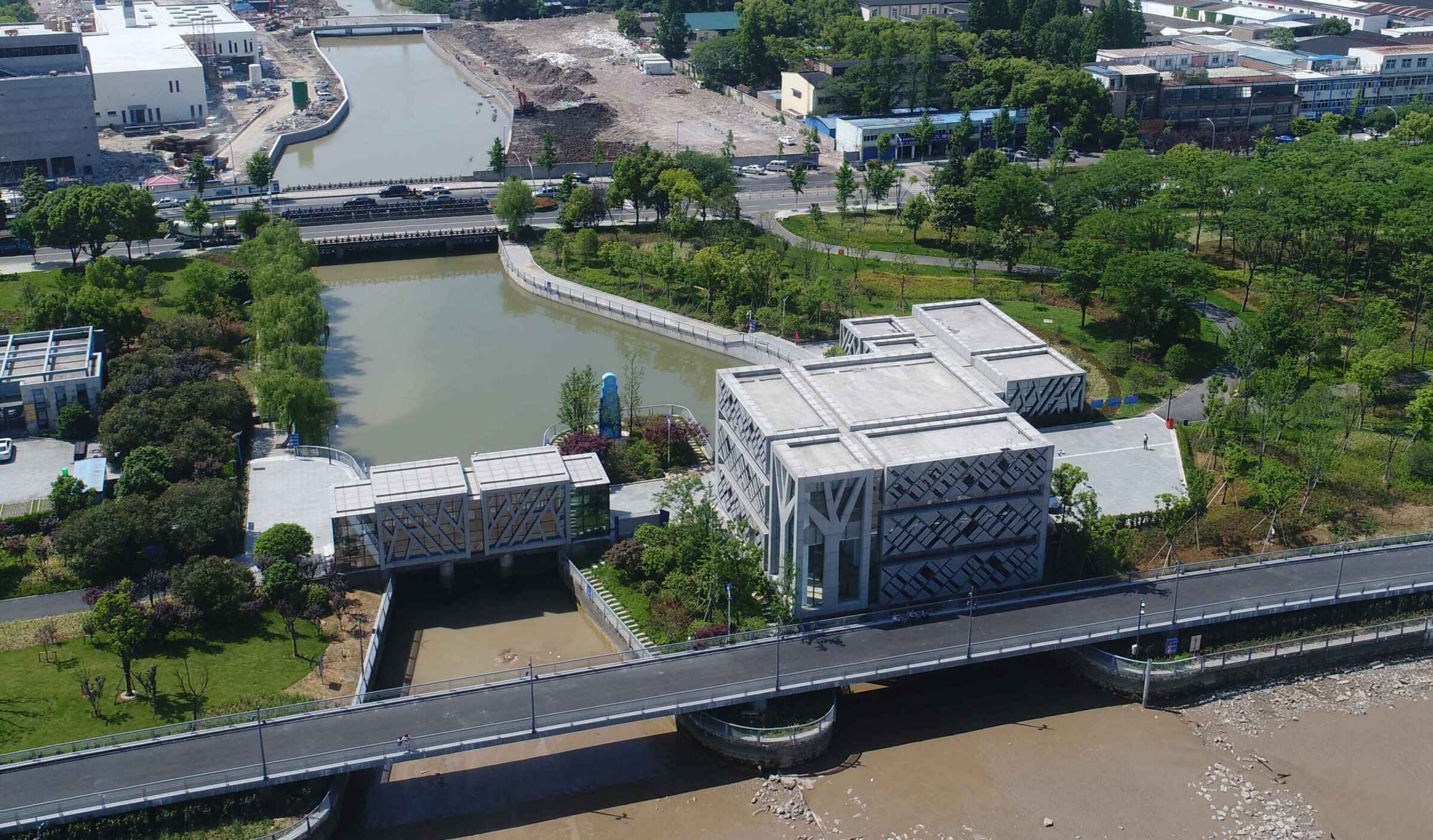 工程通過(guò)抽象手法,將樹、落葉等元素融入到建筑表情之中,從而閘站更像是沿江公園里面的雕塑,通過(guò)虛實(shí)的結(jié)構(gòu)處理,弱化了高大廠房結(jié)構(gòu)的厚重感。
