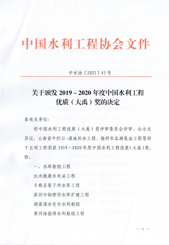 2019-2020年度中國(guó)水利工程優(yōu)質(zhì)(大禹)獎(jiǎng)