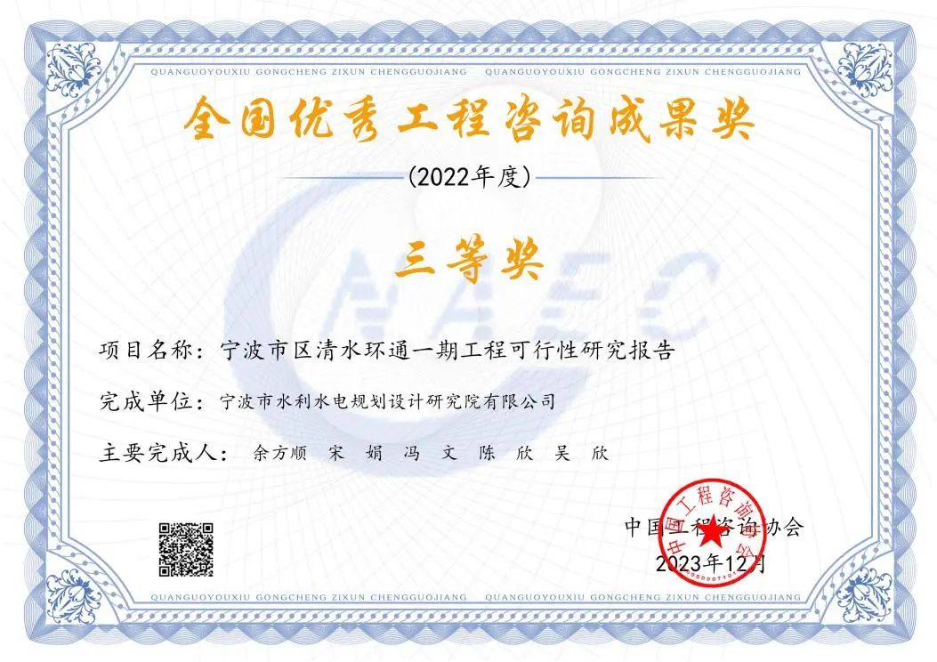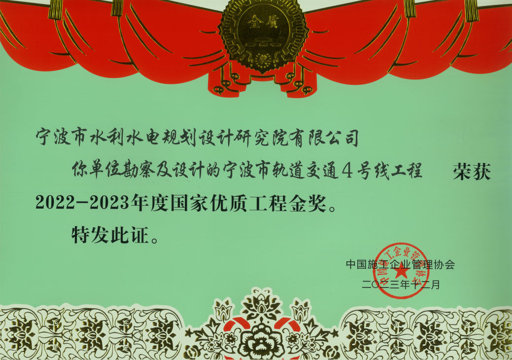2023年我院多個項(xiàng)目在各類評比中脫穎而出,榮獲中國水利工程優(yōu)質(zhì)(大禹)獎、國家優(yōu)質(zhì)工程金獎、全國優(yōu)秀工程咨詢成果三等獎、浙江省水利科技創(chuàng)新獎、浙江省水土保持學(xué)會第三屆優(yōu)秀設(shè)計(jì)三等獎、“浙江省文明標(biāo)化工地”稱號、2023 年度寧波市建設(shè)工程優(yōu)秀勘察設(shè)計(jì)獎、2023年度寧波市“甬江建設(shè)杯”優(yōu)質(zhì)工程獎、寧波市水利科技創(chuàng)新獎、寧波市水利學(xué)會優(yōu)秀論文獎等各類榮譽(yù)20余項(xiàng)。